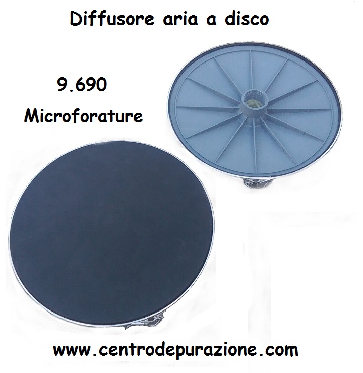 Questi tipo di diffusori cilindrici con attacco centrale dall’alto da mezzo pollice filettato e piastra metallica sono stati costruiti specificatamente per essere inseriti nelle vasche di ossidazione biologica senza tubazioni di sostegno infatti grazie alla piastra di contrappeso hanno un peso sufficiente per stare sul fondo delle vasche cosa che non è possibili con i diffusori tradizionali. Per collegamento con la soffiante è sufficiente un tubo flessibile e non è necessario entrare nelle vasche, per questo sono utilizzati spesso nelle manutenzioni dei piccolo depuratori a fanghi attivi. Hanno un diametro di 21 cm, un peso di 2 kg e lavorano a una portata di aria variabile da 1 a 9 NMc/h.